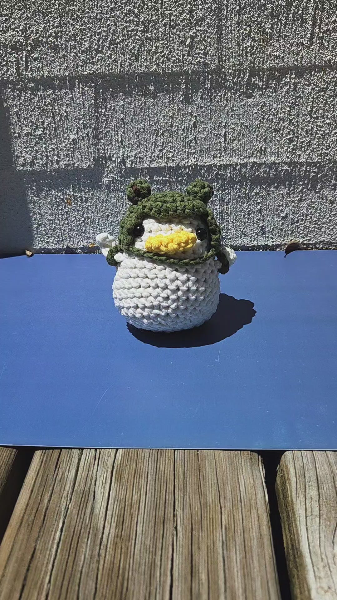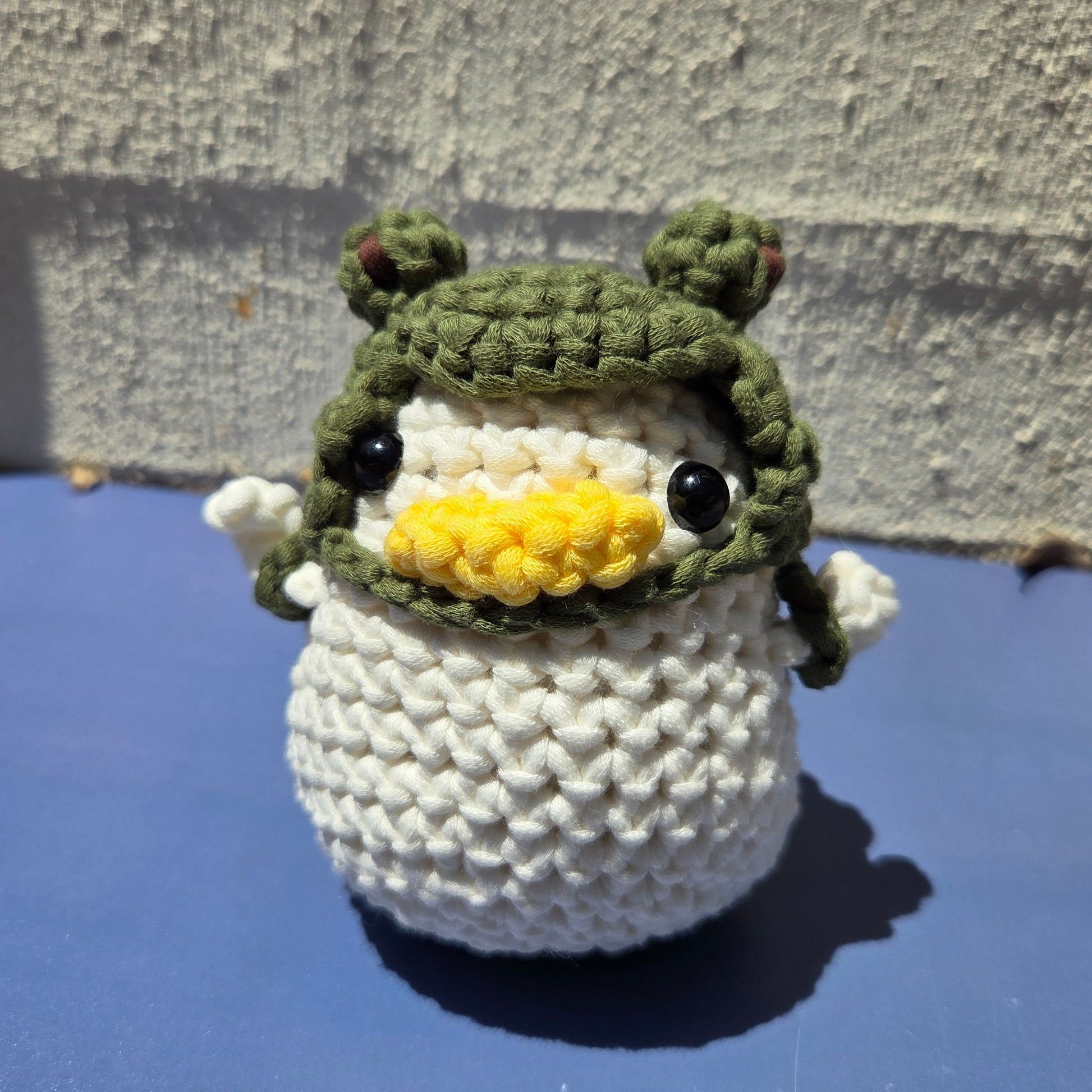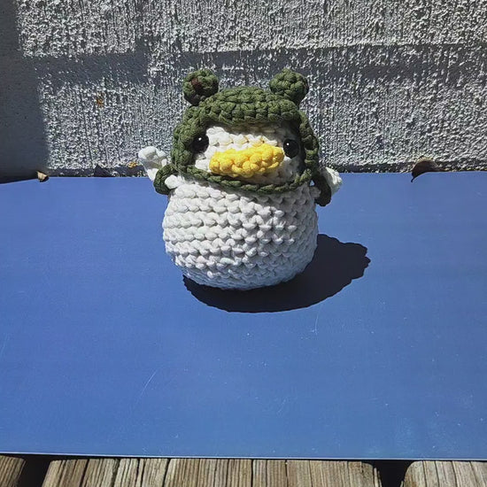 Bring home this adorable handmade crocheted Duck, complete with a tiny Frog hat and matching mini backpack!