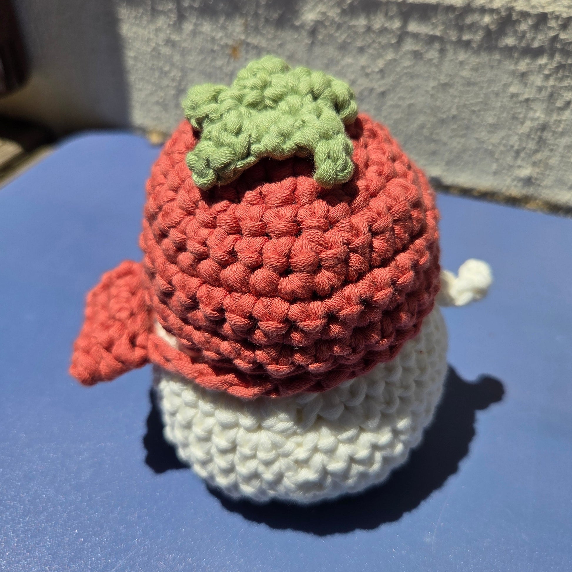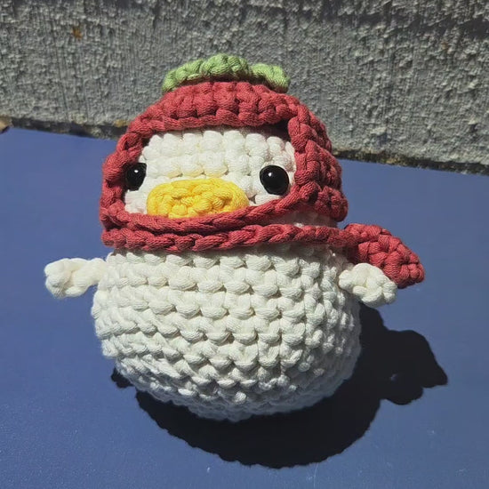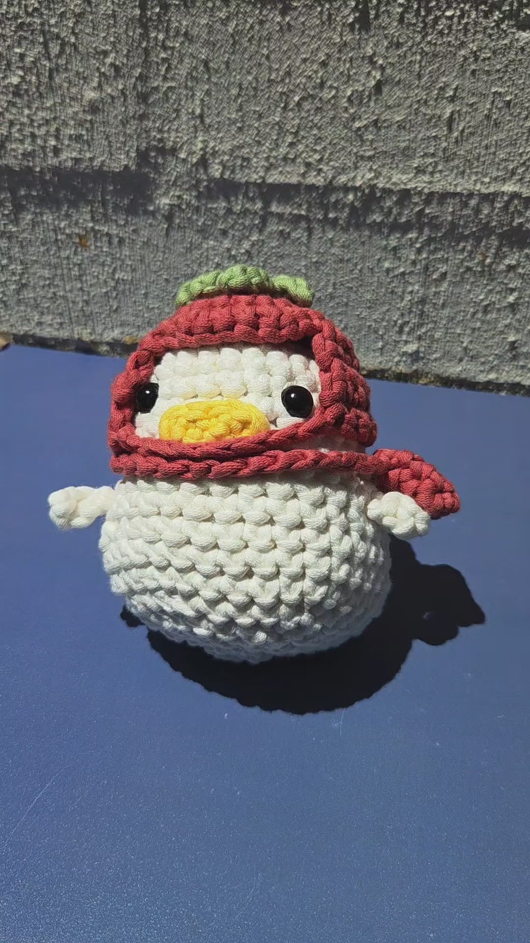 Bring home this adorable handmade crocheted Duck, complete with a tiny tomato hat and matching mini sidebag!